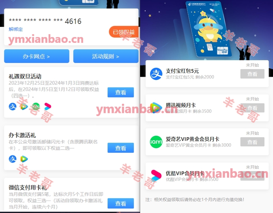 在“邮储联名卡”微信公众号,对话框权益馆-闪光卡权益,邮储银行闪光卡(含原腾讯联名卡)在2023年12月25日(00:00:00)至2024年1月3日(22:30:00)期间,累计消费(含线上、线下)满3笔(含)、且单笔满200元(含)以上。达标很简单,使用闪光卡去微信零钱通转入201元3次就行,快捷支付也算。