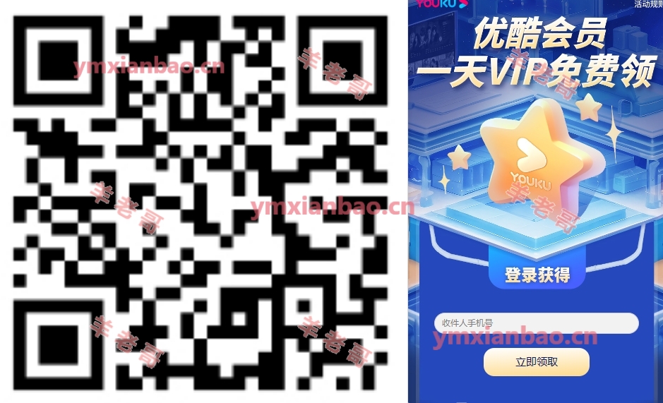 支付宝APP扫码进去,填写手机号码直接领1天优酷视频VIP会员,秒到,需要优酷会员看视频的去