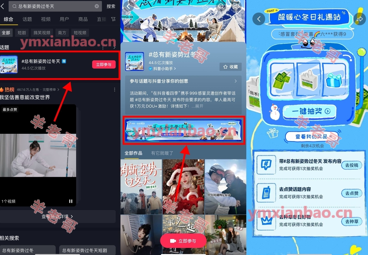 抖音APP搜索“总有新姿势过冬天”->点击话题进入->点击横幅进入->简单浏览得4次机会抽999实物等奖励
