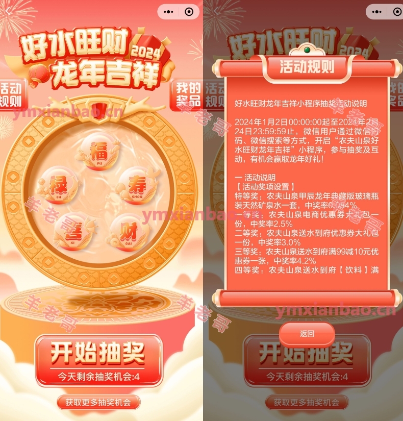 每天去参与!小程序“农夫山泉好水旺财龙年吉祥”->每天默认3次机会+浏览得5次机会->抽中玻璃瓶天然矿泉水才有用