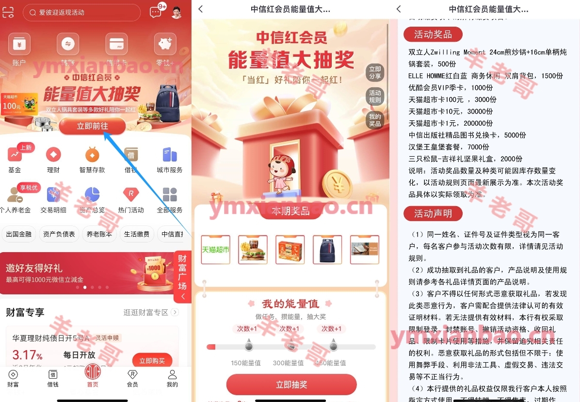 中信APP首页横幅->根据提示得能量值->使用能量值抽卡券或实物等奖励