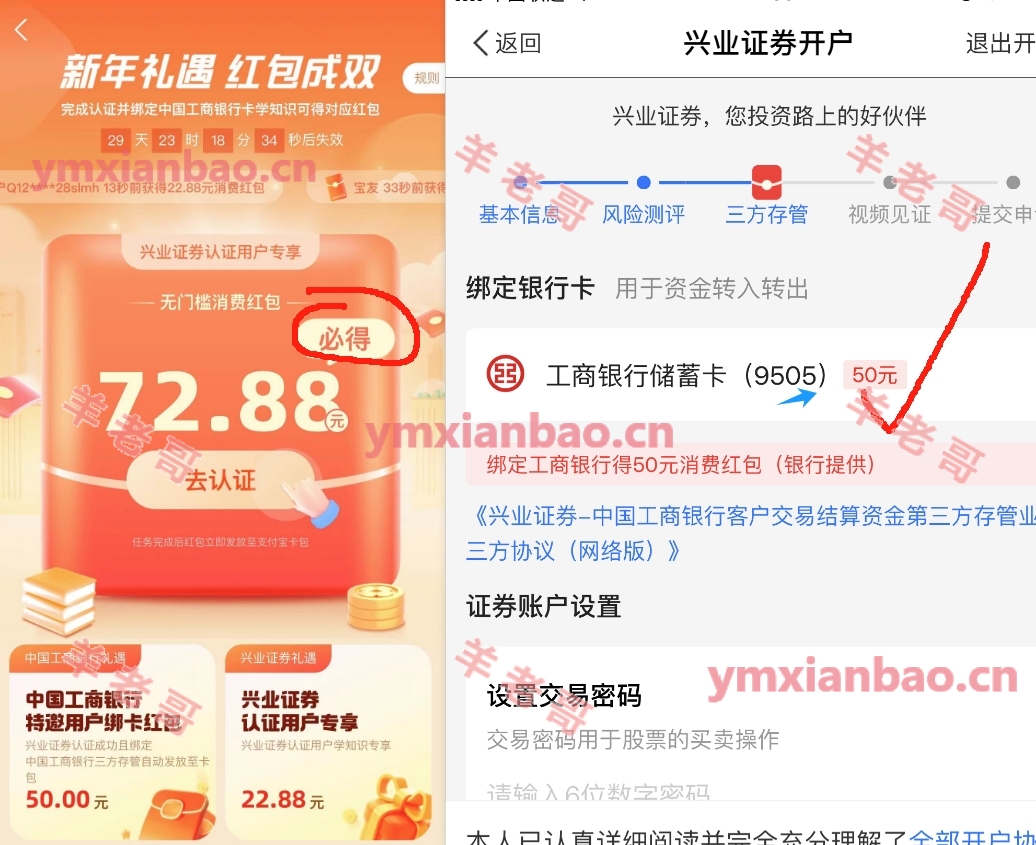 zfb开兴业证券领72+消费红包,需绑工行卡才有,显示必得就是可以,显示最高/随机放弃活动。