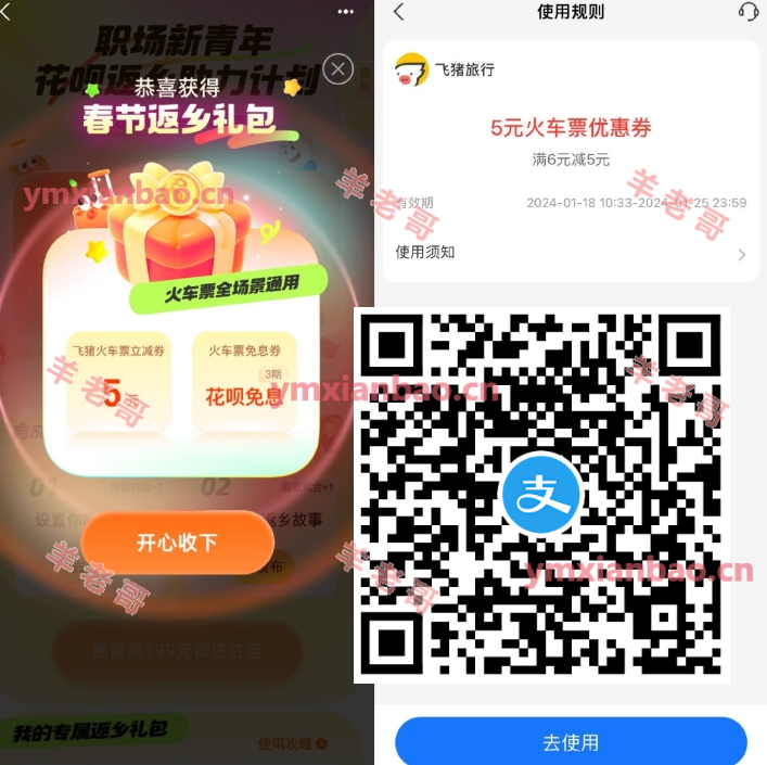 支付宝APP扫码->随便设置个地区->直接领春节返乡礼包,包含飞猪6减5亓火车票优惠券,需开过花呗状态
