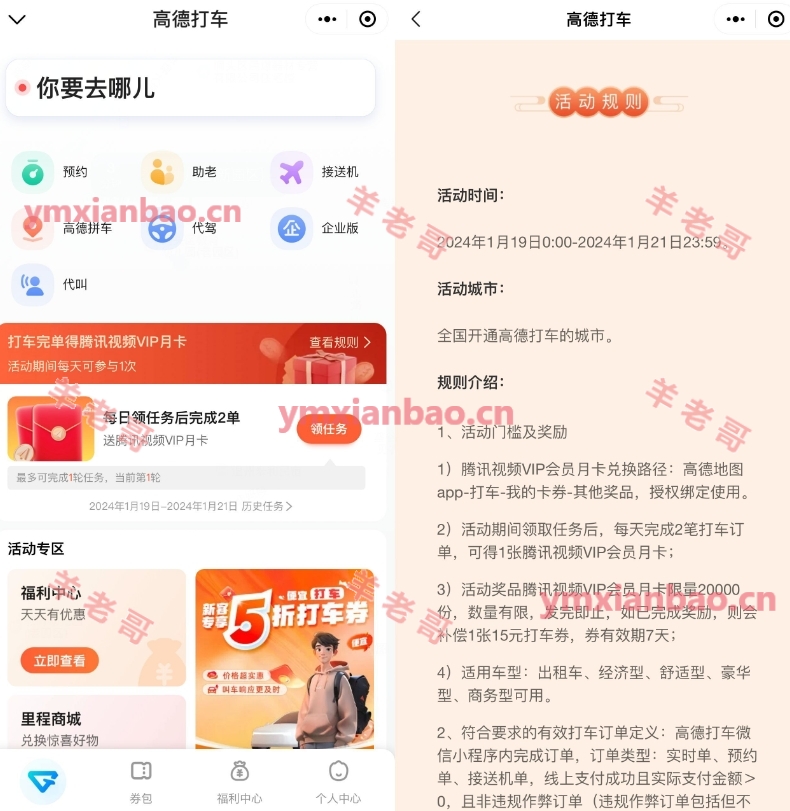 小程序,高德打车,下拉领下任务先->每日打车2次即可领腾讯视频会员月卡