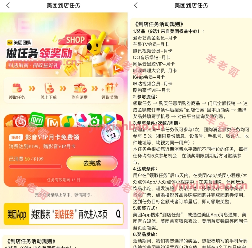 美团APP搜索“到店任务”->每个人达标都不同,达到要求即可领影音会员月卡任选