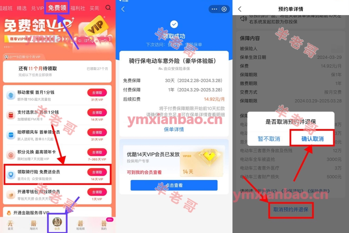 优酷APP底部“会员”->顶部“免费领”->找到骑行险 跳转直接开得14天会员->最后搜索“蚂蚁保”找到刚刚的退掉就行了