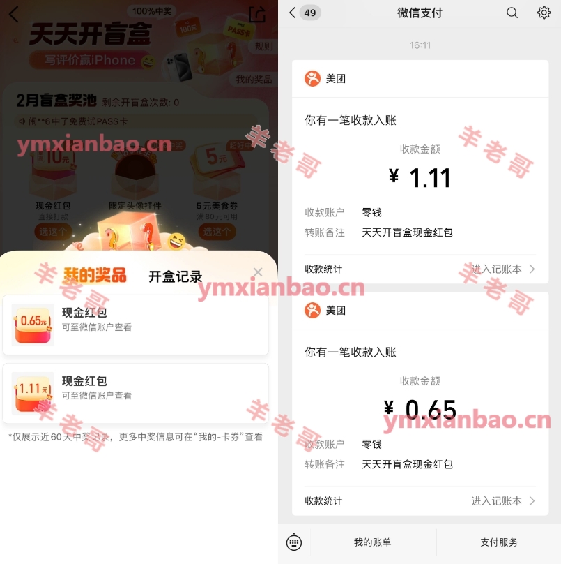 大众点评APP搜索【天天开盲盒】点击顶部图片进去活动里,选择【现金红包】参加,随便进去任意点评评价满15个字就可以开盲盒抽奖1次,分享还可以抽,刚中1.19元+0.8元微信红包,可以中多次,非必中