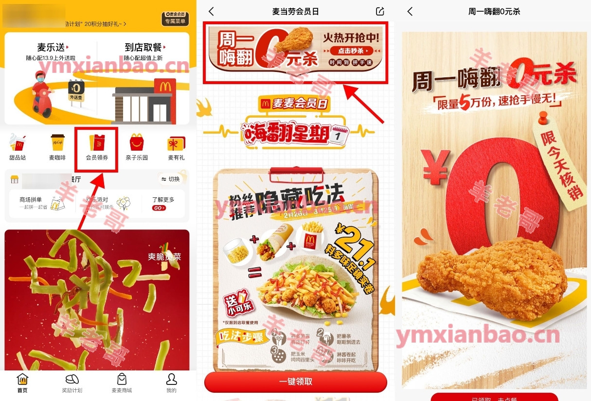 麦当劳APP首页“会员领券”->顶部周一嗨翻->直接领0元麦麦脆汁鸡,共限量5万份