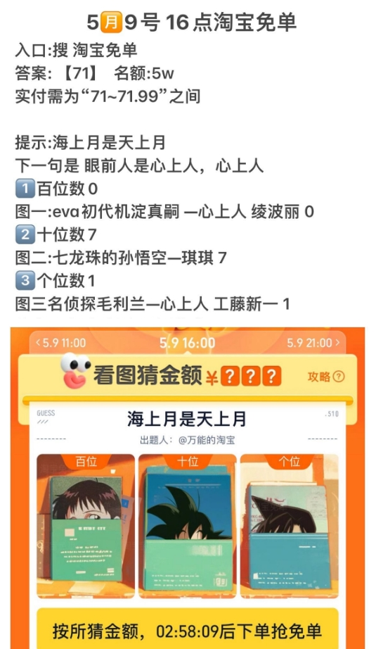 5月9日16点场参考答案:71(暂定71更改提前通知),本场共5万份免单!先加到购物车“71~71.99”之间物品(去掉优惠券的实付,比答案多加0.99就行,提前提交订单,到16点输入密码最后一位,提前58秒半或59秒就点,因为手按下去也要时间)!等一个小时左右就能知道中没中免单了(搜淘宝免单可以看到公布时间,没免可以退掉)