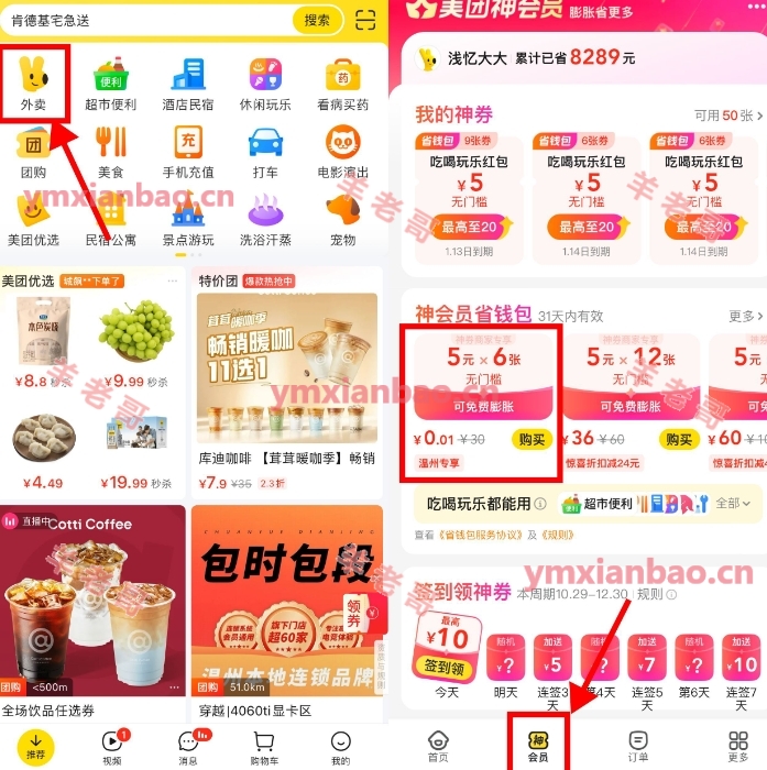 美团APP首页“外卖”,底部“神会员”,部分地区有0.01亓买6张5亓膨胀神券如无可借鉴:每天每个手机号最多可反复买5次!这是膨胀神券,团购和外卖等等都可以用,微xin识别,输入手机号直接买,在美团卡包中查看,有6张5亓膨胀神券