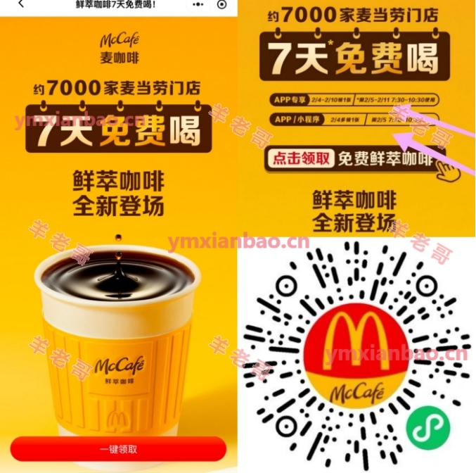 在麦当劳APP(麦当劳APP首页下拉)和小程序可各领1张免费咖啡券,一张仅限明天7:30-10:30可用,另外一张在2月5日~11日7:30-10:30可用