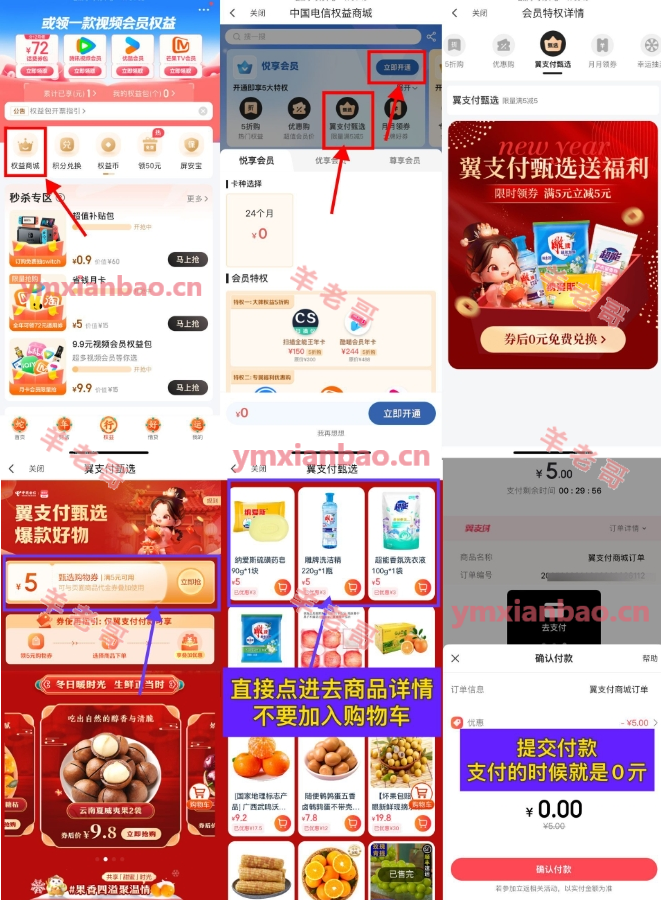 仅限电信!翼支付APP底部“权益”,权益商城,0亓开悦享会员,翼支付甄选领5亓券,下拉直接点进去拍就行了