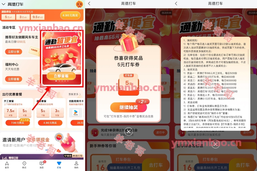 高德地图APP底部“打车”,点击轮播图进入,每天3次机会抽1~66亓打车券