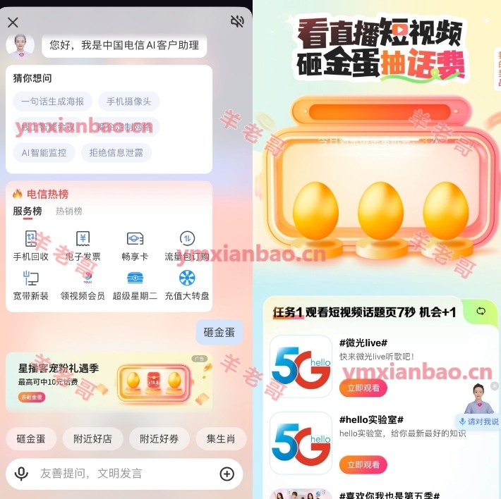 电信APP搜索“砸金蛋”,简单浏览得3次机会,抽0.1~10亓话费等奖励