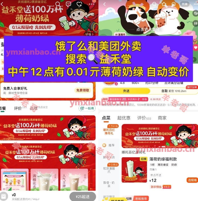 美团和饿了么APP搜索“益禾堂”,随便点一家店进入,中午12点,有0.01亓薄荷奶绿