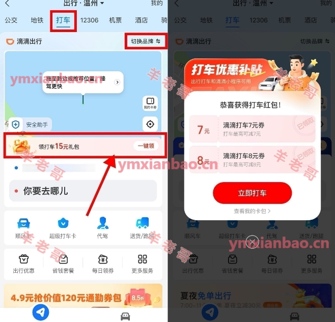支付宝首页“出行”顶部“打车”右上角切换品牌,地图下方有打车立减券和折扣券其他:一:高德新人10无门槛打车卷,老用户2券,全国都能用,七天有效期记得用,打车基本都一分,多号领