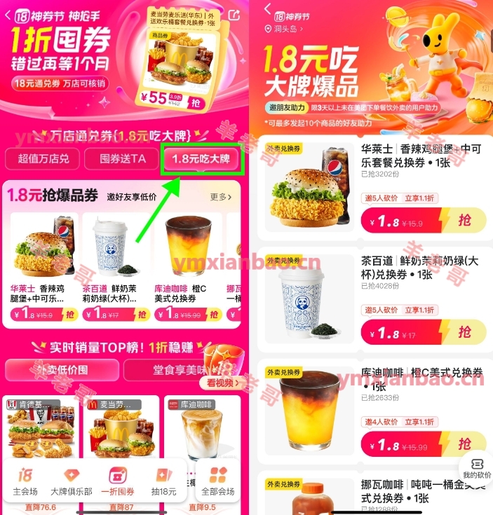 美团首页顶部18日-超级大牌-底部一折囤券-1.8元吃大牌,选择自己想要的邀4人助力,完成后即可1.8亓买券,这是外卖配送的,不是到店券