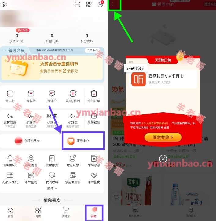 永辉生活APP底部“我的”,领券中心,直接点左上角返回,会自动弹出天降15天喜马拉雅会员(自测)