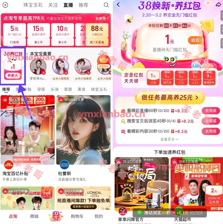 点淘APP首页“38养红包”,2月20日~3月2日每天浏览攒定金荭包,并在当天提取,定金荭包在38节可以便宜买东西