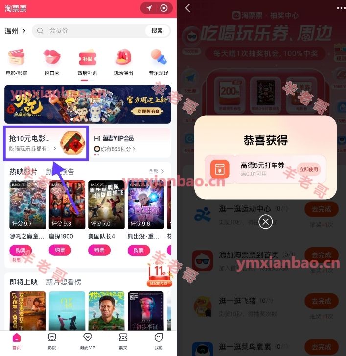 支付宝搜索“淘票票”,抢10亓电影票券,浏览得次数抽高德打车券、1688会员等