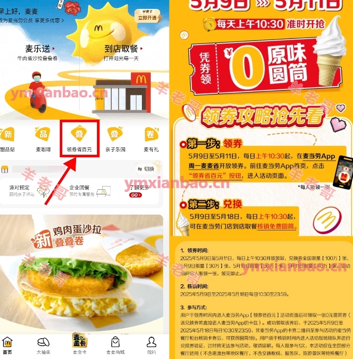麦当劳APP首页“领券省百亓”,5月9日~11日每天10点30分开始,直接领免费甜筒到店核销即可,共限量100万份