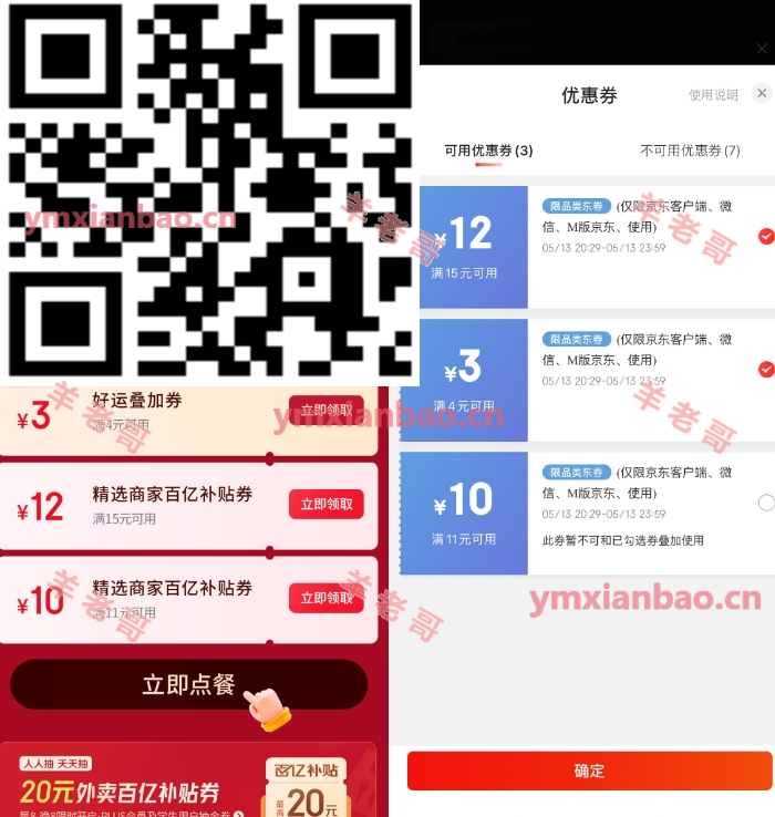 京东app识别,直接领15-12亓外卖券 和 4-3亓叠加券,就等于京东外卖15-15亓