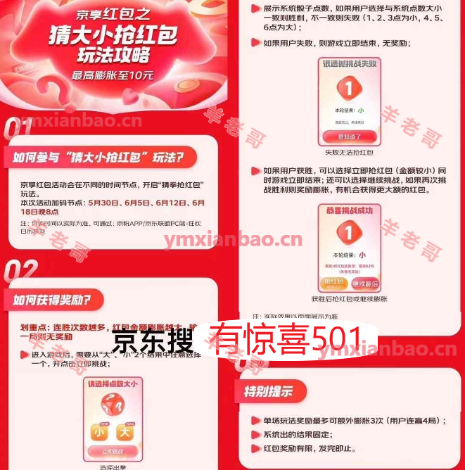 今天10:00整额外加码场次,京东app搜索“有惊喜501”,提前先领完三次日常,准点再搜索才有加码!连续猜对最高10!连续对四次阶梯分别为1/2/4/10,建议拿个2就可以了