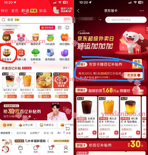 京东饭卡冲100亓25-20亓外卖券 可退