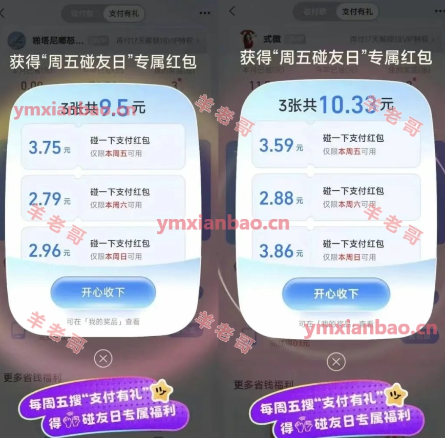 zfb搜索支付有礼或首页横幅点进去,弹窗或者多摸几下貔貅部分有碰一下3/9券(均不弹去集卡换好礼和转账页面等待几秒钟试一下),建议用不常用的小号今天面额大。支付宝0亓:碰一下小蓝环和上边不冲突:支付宝识别,新的碰一下荭包,每天一次活动均不冲突,先领券!