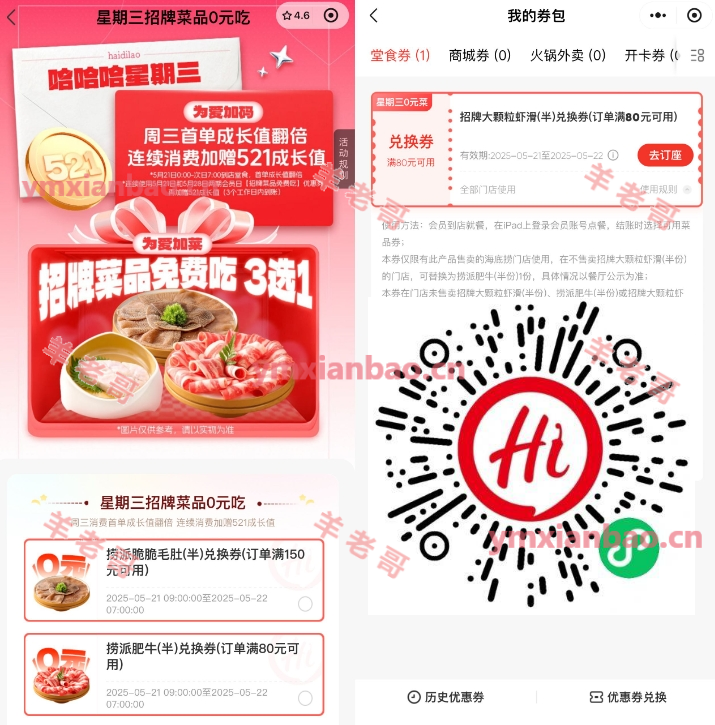 微xin识别,5选1领半份虾滑/肥牛/毛肚券,限5月21日可用,刚好要吃海底捞的可以领下