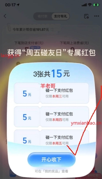 支付宝搜索支付有礼或首页横幅周五碰友日点进去,弹窗或者多摸几下貔貅有连续三天的碰一下券,不弹换小号试,支付宝0亓: