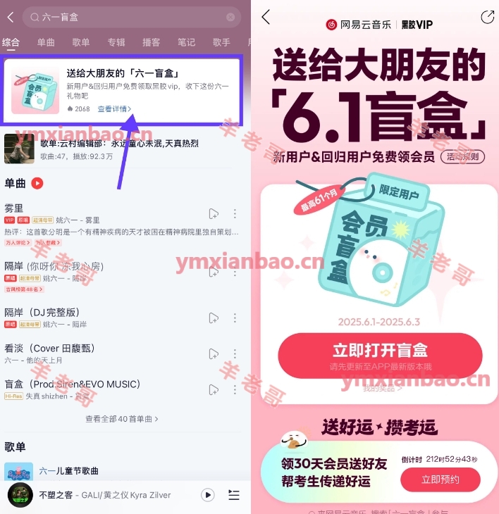 网易云音乐APP搜索“六一盲盒”,新用户及30天未访问的回归用户,抽最高61个月黑胶会员