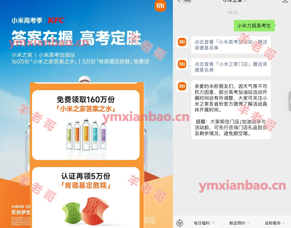 微xin公众号:小米之家,回复“小米力挺高考生”查看门店,所有用户到店可领矿泉水,学生额外肯德基定胜糕,部分门店参与,建议提前电联网店咨询