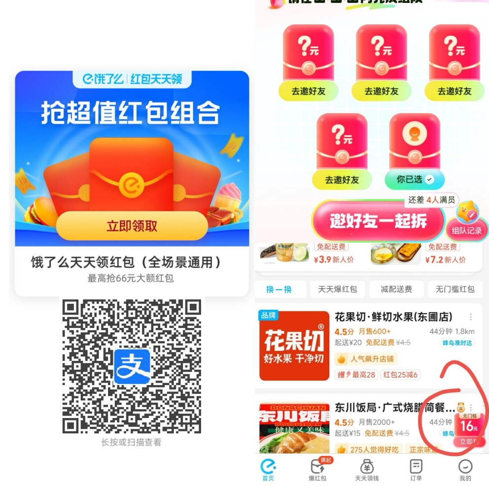支付宝识别,左上角返回首页,右下方16,5人组队其中一人是16无门槛外卖,可以邀自己zfb小号不同号码组队