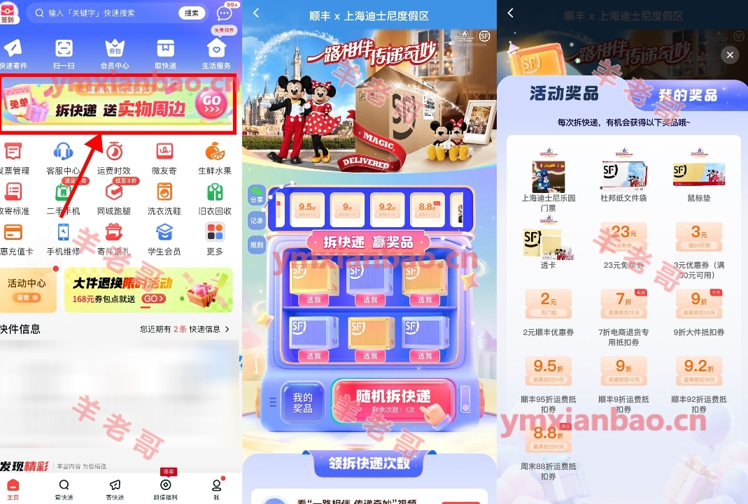 顺丰APP或小程序,首页横幅“拆快递”,浏览得次数,抽寄件券或实物等
