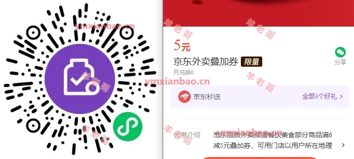 叠加:微xin识别,使用3金币兑换5亓京东外卖券,这个券是可以叠加别的券使用的,金币不够的左上角返回领