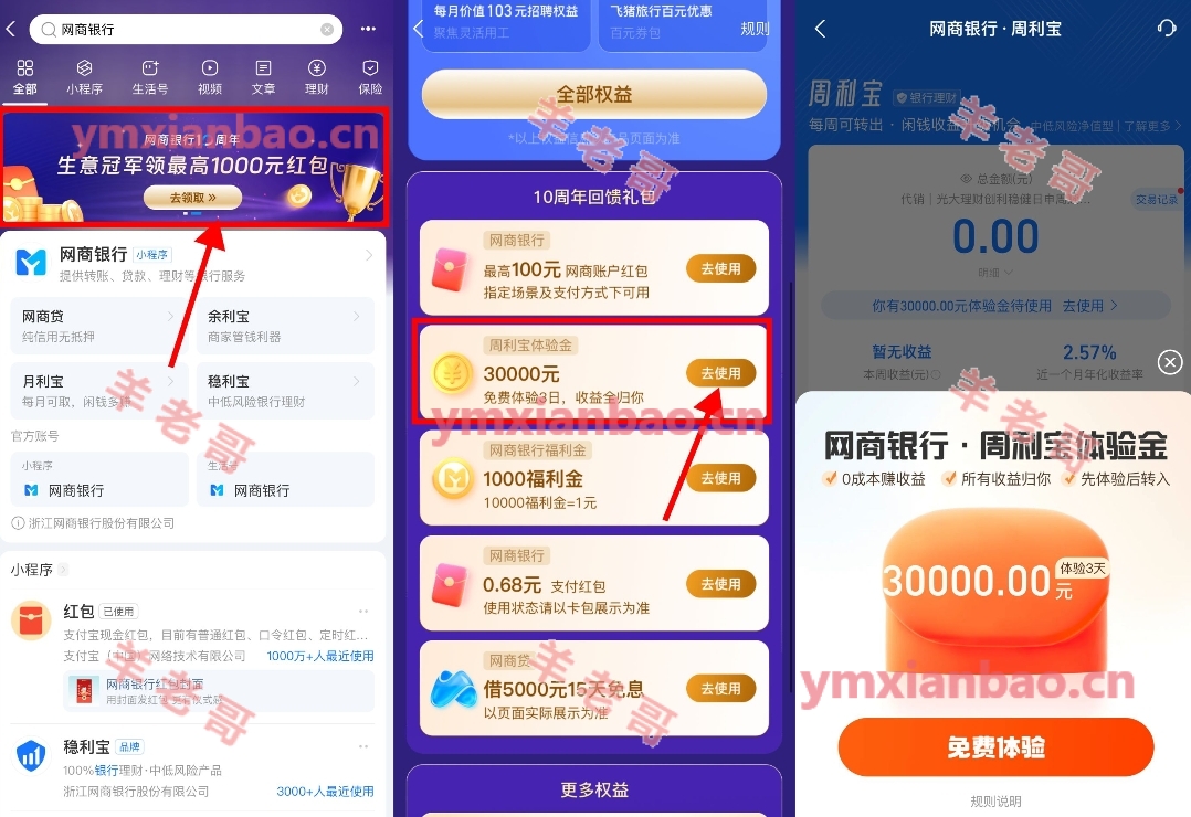 支付宝搜索“网商银行”,点横幅进,下拉领3w体验金,如果不显示就重复进一下,领了点去使用,3天后大概可得6亓左右