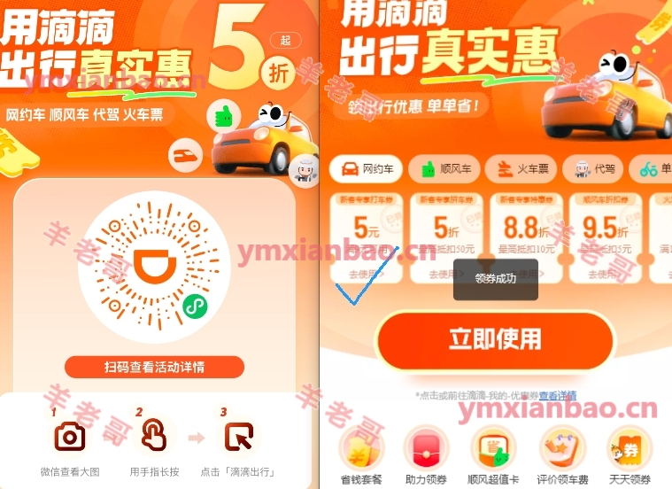 微xin识别,直接领,部分有8打车券或5折。