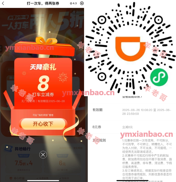 滴滴部分8亓或5折打车券