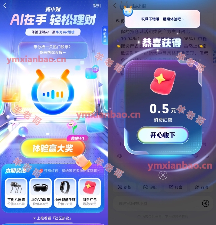 支付宝搜索“蚂小财”,进入随便点一个,浏览完成抽0.5~88亓消费荭包