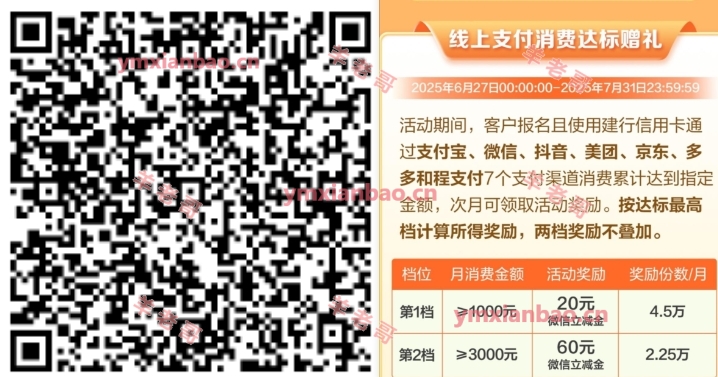 需xyk,路径:建行生活app – 热门活动第一个-消费至高得120元立减金或识别跳转建行生活app,报名后看规则,7个支付渠道消费累计消费达3000,次月可领60亓微xin立减金。活动期间可参加两次,也就是6月和7月各一次,合计120。