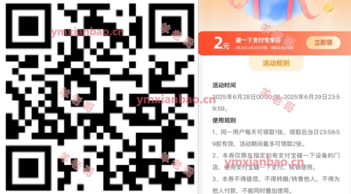 支付宝识别,2亓碰一下券,6月28日、6月29日每天1次,支付宝0亓: