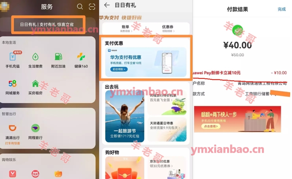 需华为手机负一屏活动,荣耀无,负一屏就是手机桌面左滑最左边的页面,一直往左翻到下面这个页面,话费选50,付的时候新绑卡,就会显示有绑新卡10的立减,如果不显示有券就不符合,如果绑过卡就全部解绑再去尝试。参加过的自测,付前显示优惠,不显示忽略。