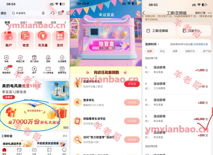 工行app首页如图,进去找到幸运盲盒,多次机会可以抽,运气中6.6w豆,商城可以换50多京东e卡,新的一月也可以去任务中心或搜消费季看看有没有活动,我的-工银i豆可以兑东西,或者攒着以后再换微xin识别,找不到入口:APP-我的-权益中心-奇幻大冒险/幸运盲盒,也可以抽多次