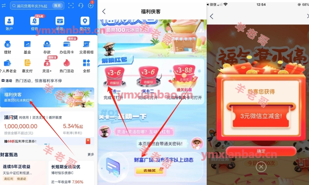 浦发银行app,首页,横幅福利侠客,2类可以第一个3-6,一类可玩后面的3+3
