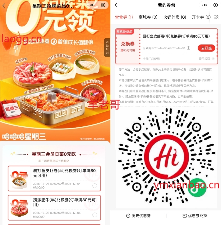 微xin识别,5选1领半份虾滑/肥牛/毛肚券等,限明天可用,刚好要吃海底捞的可以领下