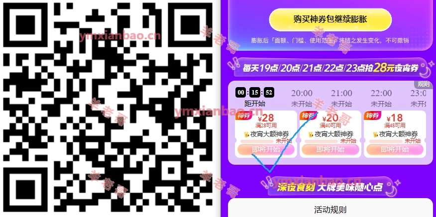 美团app识别,宵夜28无门槛,19-23点的每个整点可抢