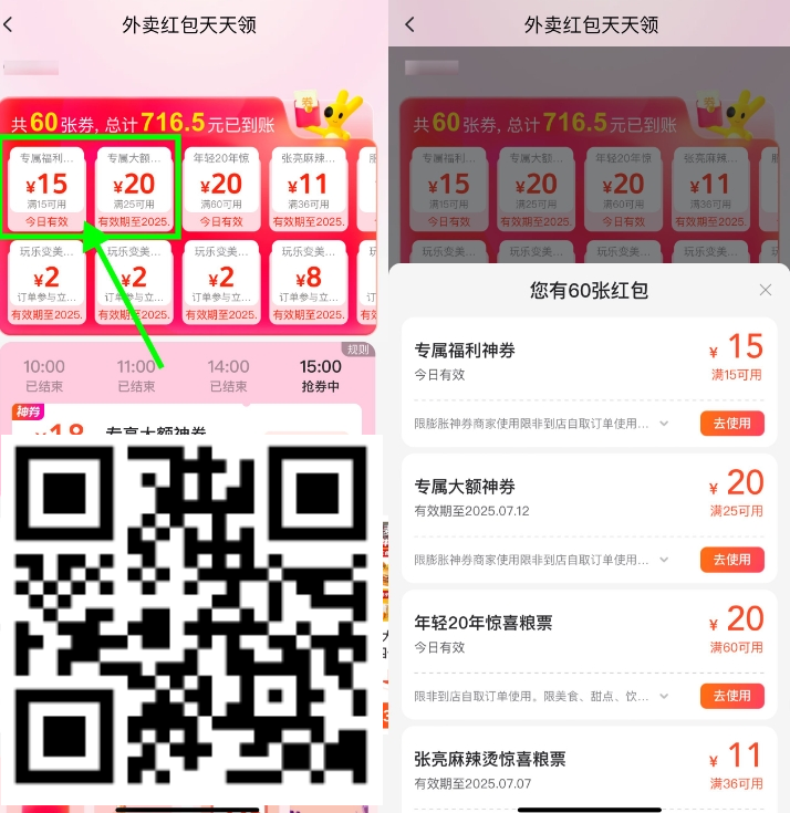 美团app识别,直接领15-15和25-20,数量未知,下午领了用过的可重复领了用,今天用不到的可以下预约单明天后天的外卖