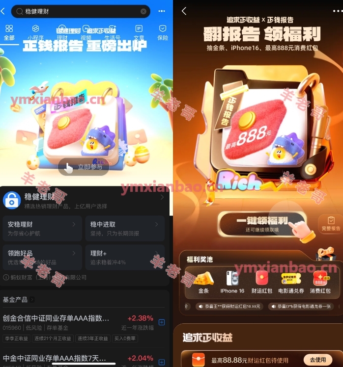 支付宝搜索“稳健理财”,每天有4次机会,抽1万份8亓红包或5200份电影票兑换券