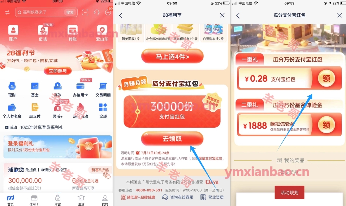 浦发银行app-首页-28福利节-下拉底部瓜分,3万份0.28浦发支付宝立减金
